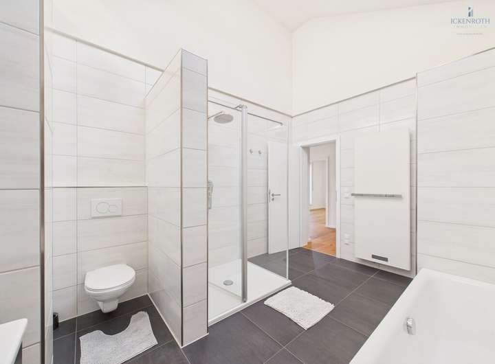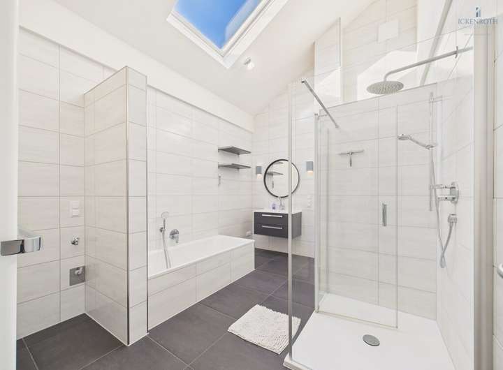 Im Obergeschoss erwarten Sie zwei Zimmer, davon eines mit "begehbarem Kleiderschrank" sowie ein riesiges, modernes Tageslicht-Badezimmer mit Dusche, Badewanne und hochwertigen Ausstattungsdetails. Ein echtes Highlight! Hier können Sie auch bequem Ihre Waschmaschine unterbringen!