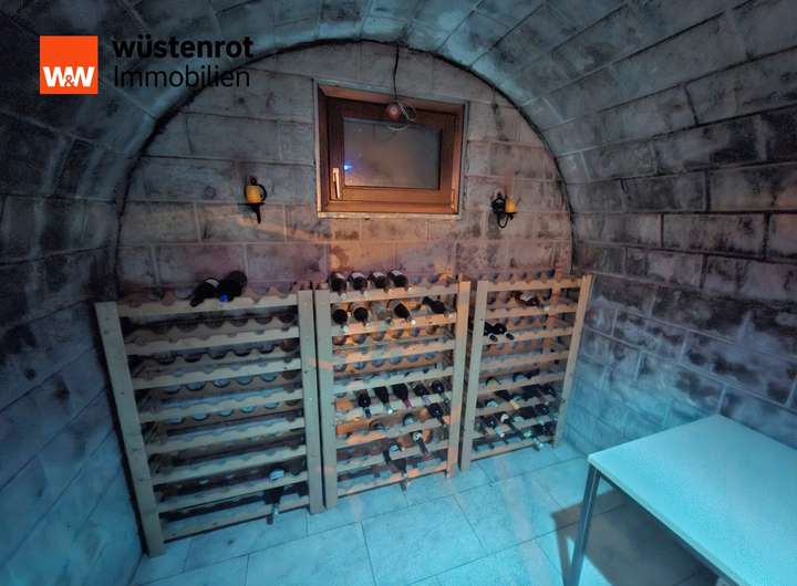 Das Interieur kombiniert stilvolle Fliesen- und Parkettböden, einen charmanten Erker und einen lichtdurchfluteten Wintergarten zu einem harmonischen Ambiente. Der ausgebaute Keller bietet zusätzlichen Wohnraum – perfekt für jüngere Familienmitglieder. Hier finden Sie weitere Zimmer, die vielfältige Nutzungsmöglichkeiten bieten, sowie einen einladenden Barraum, der sich ideal für gesellige Abende eignet. Der angeschlossene Weinkeller lädt dazu ein, exklusive Weine in einer außergewöhnlichen Umgebung zu genießen.