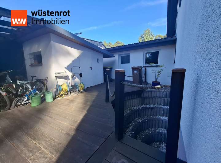 Der überdachte Terrassenbereich und der Balkon im Obergeschoss bieten zusätzliche Entspannungsmöglichkeiten. Der großzügige Garten mit automatischer Bewässerung und ein Spielplatz laden zur Freizeit und Erholung ein. Ein elektrisches Einfahrtstor und reichlich Stellplatzmöglichkeiten, inklusive einer Doppelgarage mit integrierter Werkstatt, sorgen für zusätzlichen Komfort.