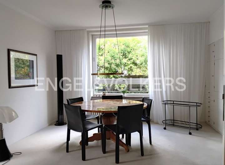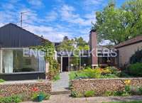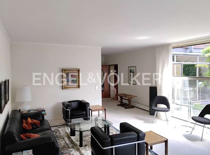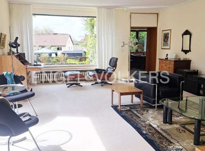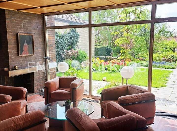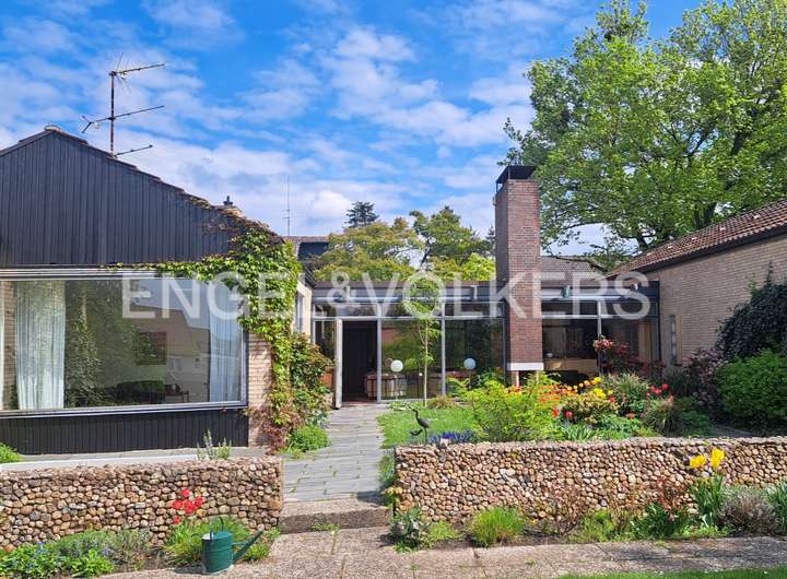 Dieser einzigartige Architektenbungalow mit einem zum Garten hin offenen Atrium steht auf einem ruhig gelegenen, großzügigen Grundstück mit altem Obstbaumbestand, das 2027 m² umfasst.