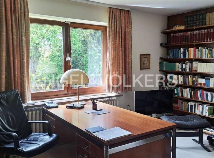 Vom Flur geht es auch in die großzügige Küche mit Blick in den Garten. Die Küche verfügt über eine Speisekammer. Von der Diele gelangen Sie in den offen gehaltenen Wohn- und Essbereich. Hier befindet sich das absolute Highlight der Immobilie. Die große Fensterfront zum Atrium lässt sich elektrisch komplett in den Boden versenken, sodass Sie den offenen Bereich zum Garten genießen können. An das Wohnzimmer grenzt das Arbeitszimmer eingerichtet mit einer Bibliothek aus Edelholz.