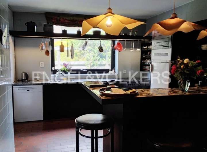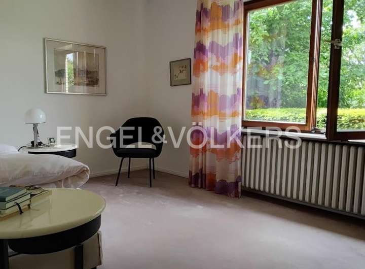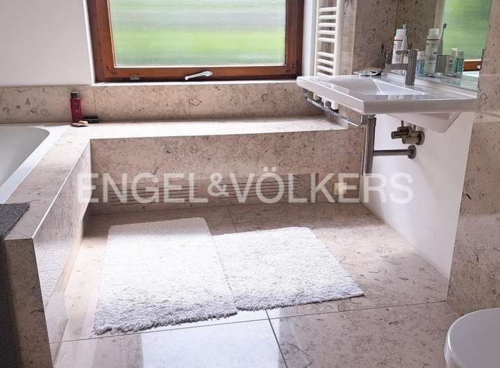 Der teilunterkellerte Bungalow aus dem Jahr 1963 zeichnet sich zudem durch seine besondere U-Form aus und verfügt über eine große Doppelgarage mit zwei elektrischen Toren. Ergänzt wird er durch ein Satteldach mit Ziegeln an der rechten und linken Seite sowie einem Flachdachanteil im mittleren Bereich. Der Wohnbereich erstreckt sich über 232 m² Wohnfläche mit insgesamt 3 Bädern und 8 Zimmern. Zwei Bäder wurden bereits erneuert. Eines davon ist mit hochwertigem Marmor ausgestattet.