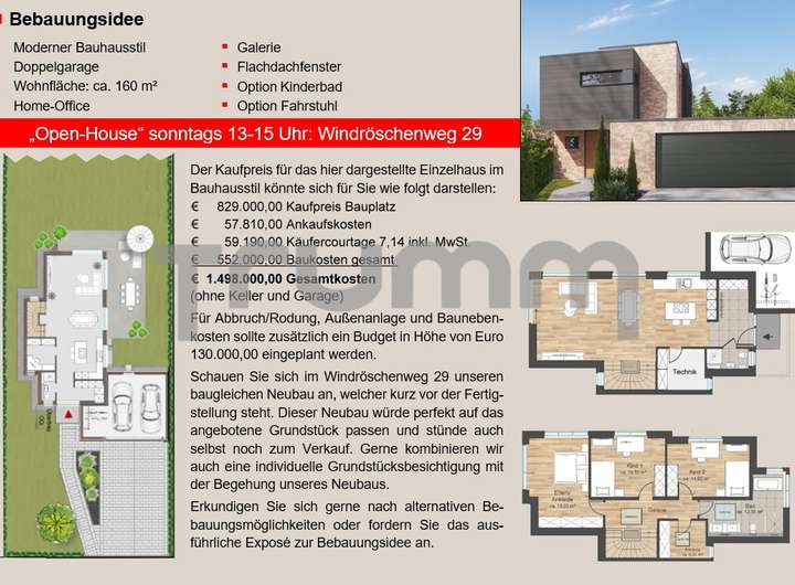 In unserer Eigenschaft als Bauträger mit fast 50-jähriger Erfahrung haben wir Ihnen eine Bebauungsidee mit einem Einzelhaus im Bauhausstil zu dem Grundstück projektiert, wie wir es für Sie auch erstellen könnten. Ein fast fertiggestelltes Haus dieser Art könnten Sie gleich in der Nachbarschaft zum Baugrundstück besichtigen.