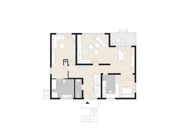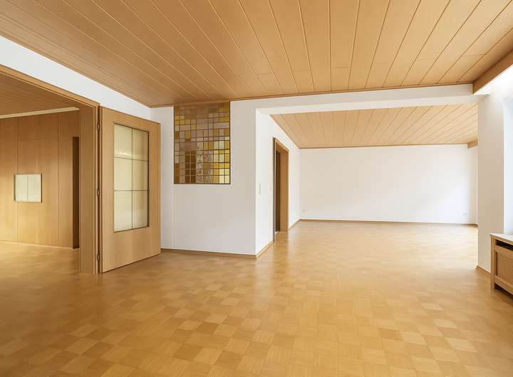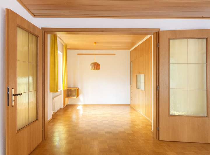 Bereits beim Betreten empfängt Sie ein großzügiger Willkommensbereich. Das Herzstück des Erdgeschosses ist der lichte Wohn- und Essbereich mit ca. 50 m², der durch Flügeltüren elegant miteinander verbunden ist. Der Grundriss erlaubt die Gestaltung einer modernen, offenen Küche – ideal für ein offenes Wohnkonzept mit dennoch klar abgegrenzten Bereichen.
