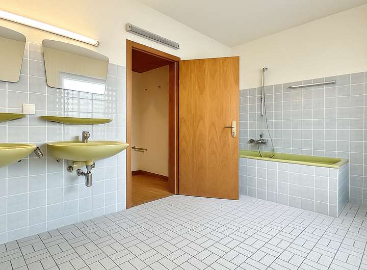Zusätzlich bietet das Erdgeschoss ein großes Zimmer, das sich hervorragend als Schlafzimmer oder Arbeitszimmer eignet. Von hier aus gelangen Sie direkt in ein geräumiges Tageslichtbadezimmer. Ein Gäste-WC im Eingangsbereich rundet das Angebot ab.