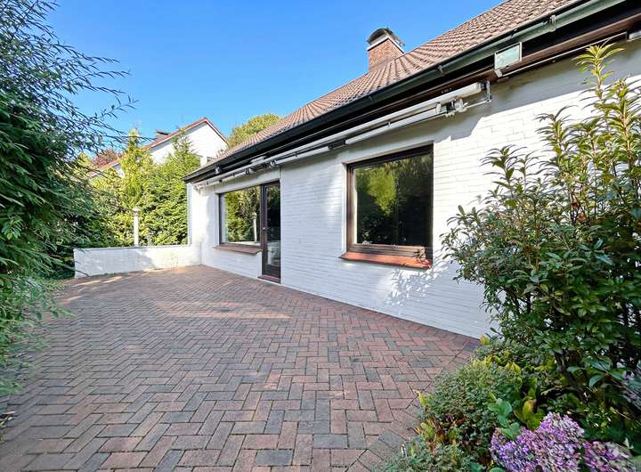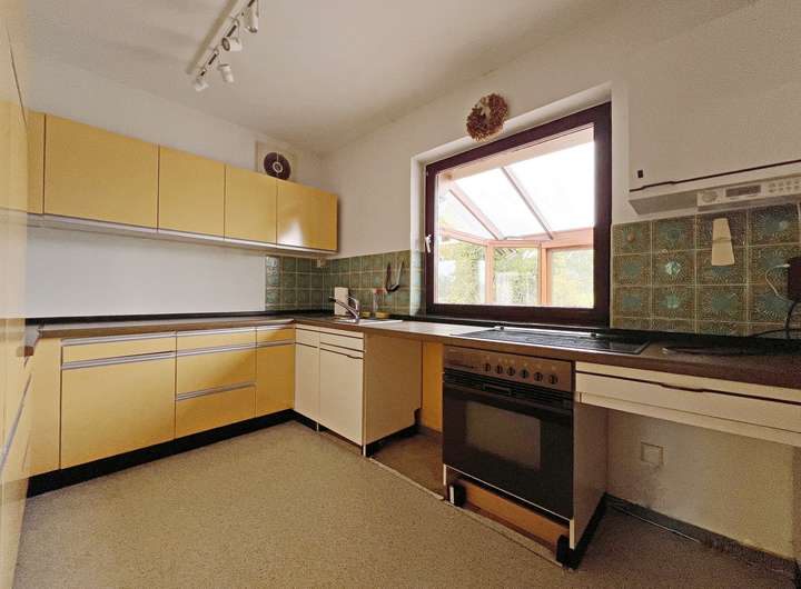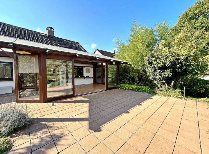 Erdgeschoss: lichtdurchflutetes Wohnzimmer mit Essbereich und Zugang zur Frühstücksterrasse, großzügiger Wintergarten mit Fußbodenheizung mit Blick ins Grüne, Küche, Schlafen, Gästezimmer, Gäste-WC und Vollbad.