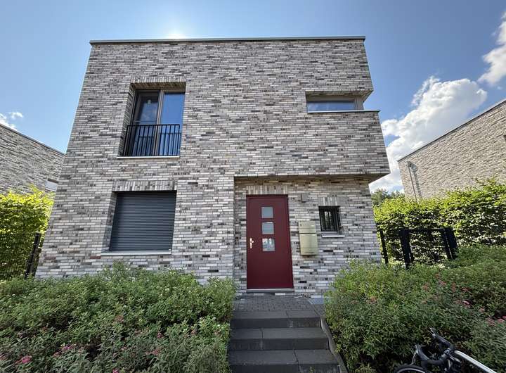 Das Haus selbst besticht durch sein modernes Design und hochwertige Ausstattung. Beim Betreten im EG befindet sich zur rechten Seite ein funktionales Gäste-WC. Zur linken Seite gelangen Sie in die angenehm geschnittene Küche mit Einbauschränken und modernen Geräten. Sowohl vom Flur als auch von der Küche ist das Esszimmer zu begehen. Von hieraus erreichen Sie das Wohnzimmer mit dem schönen Blick in den Garten. Die Terrasse lädt zu gemütlichen sommerlichen Abenden ein. Besonders hervorzuheben sei noch der Kamin im Wohnbereich.