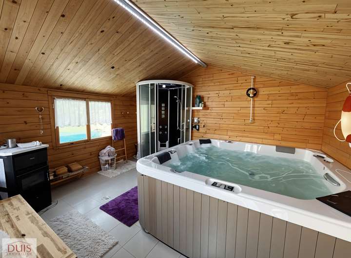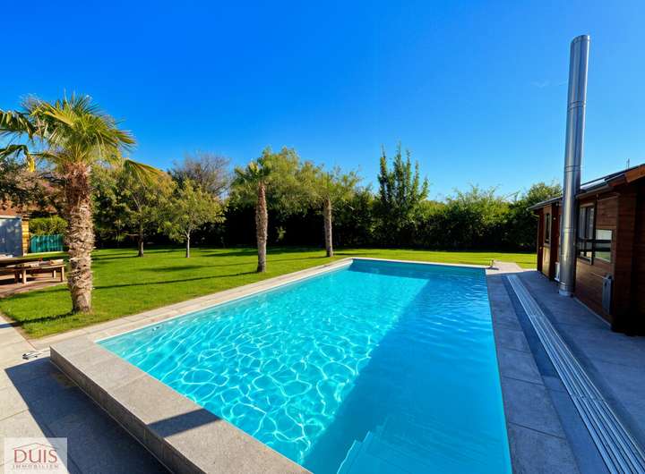 Vom Wintergarten aus gelangt man in den weitläufigen Garten mit großer Terrasse, der mit einem Pool (8 x 4 m, 1,5 m tief) und einem hochwertigen Spa-Haus keine Wünsche offenlässt. Das Spa-Haus ist mit einem Whirlpool, einer Dampfdusche und einem Holzofen ausgestattet – ein privater Wellnessbereich direkt im eigenen Garten. Seit 2025 verschönern zudem drei Hanfpalmen den Poolbereich und verleihen dem Garten ein mediterranes Urlaubsflair.