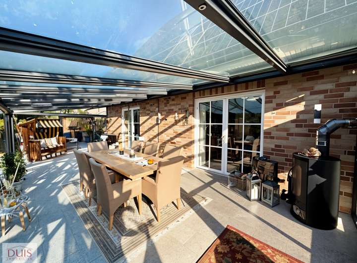 Bereits beim Betreten des Hauses spürt man die durchdachte Planung und hochwertige Ausstattung. Der lichtdurchflutete Wohnbereich öffnet sich zum beeindruckenden Wintergarten aus dem Jahr 2022. Mit einer Größe von ca. 10,5 x 4,2 m, dreifach verglasten Fenstern, zwei Schiebetüren mit Insektenschutz, elektrischen Sonnenrollos und einem gemütlichen Holzofen lädt dieser Raum das ganze Jahr über zum Entspannen ein.