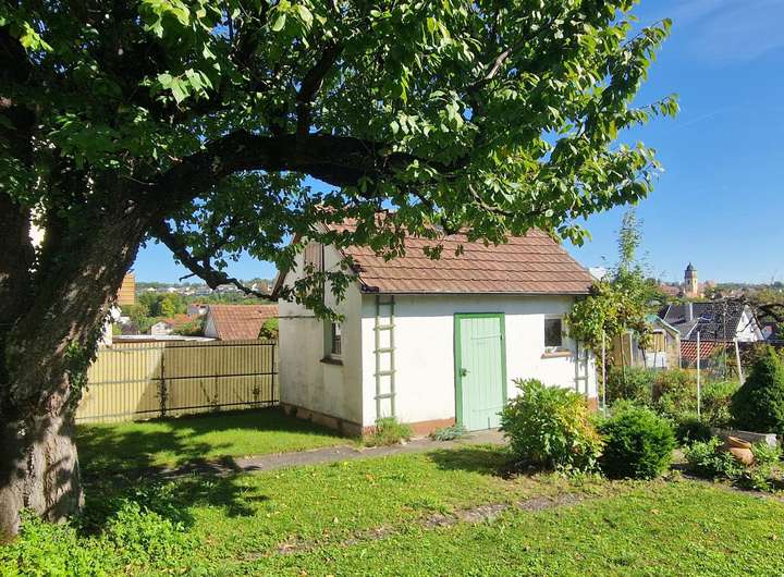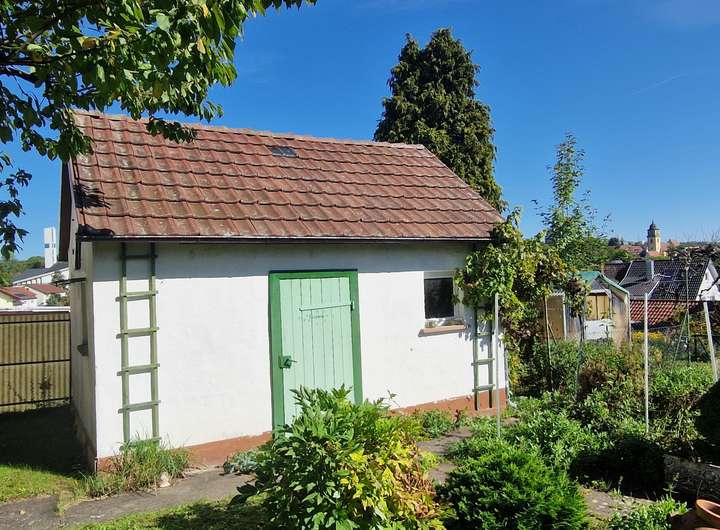 Ein absoluter Hingucker ist das gemauerte Gartenhäuschen in Verbindung mit dem großen Garten und dem Baumbestand. Ihrem grünen Daumen sind hier keine Grenzen gesetzt!
