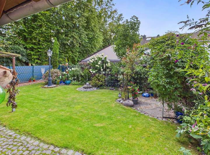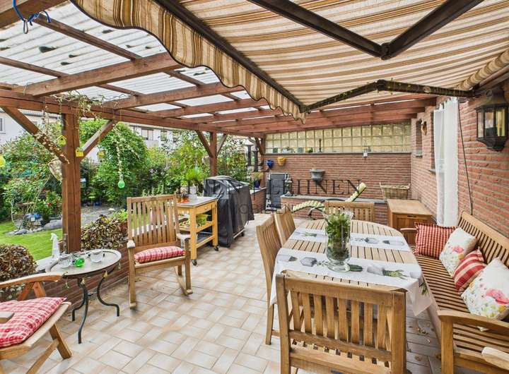 Der gepflegte Außenbereich bietet rund 200 m² Gartenfläche und lädt mit seiner überdachten Terrasse (ca. 35 m²) zu entspannten Stunden im Freien ein. Hier ist ausreichend Platz für Kinder zum Spielen oder gesellige Familienabende im Sommer.