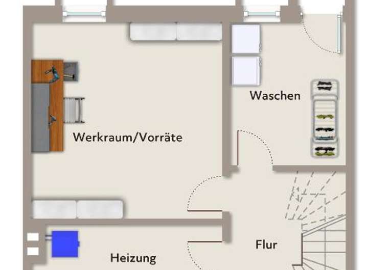 Flur, Waschkeller, Heizungskeller, Vorräte, Hausanschlussraum