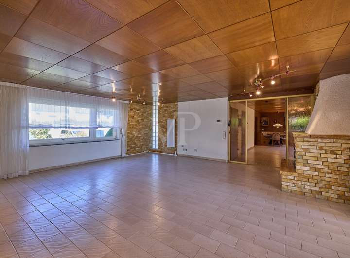 Das Herzstück dieser Wohnung ist das große Wohnzimmer mit Kamin für gemütliche Abende, die großen Fenster schaffen eine helle und freundliche Atmosphäre. Von hier haben Sie Zugang zum Wintergarten und zum herrlichen Garten mit Blick zum Feld.