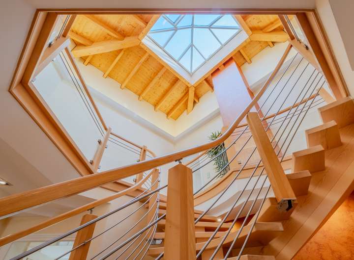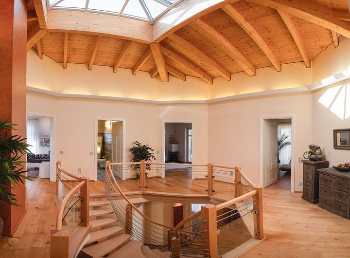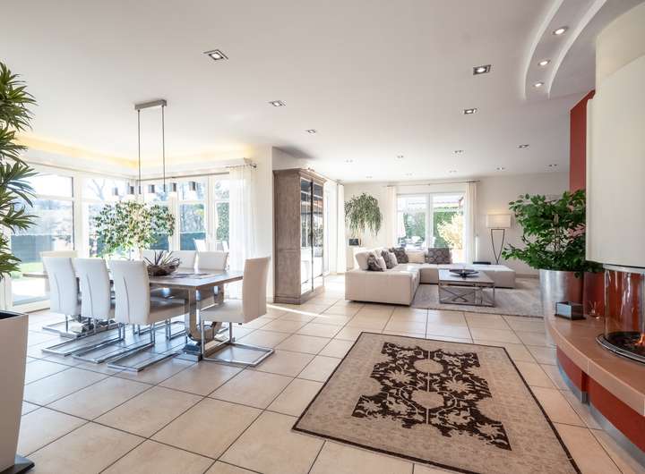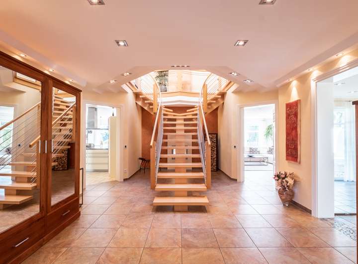 Bereits der repräsentative Eingangsbereich vermittelt eine beeindruckende Großzügigkeit, die sich im gesamten Haus fortsetzt. Das helle und offene Wohnzimmer mit edlem Kamin und bodentiefen Fenstern eröffnet den Blick auf eine geschützte Sonnenterrasse und lädt zum Verweilen ein. Eine stilvoll eingerichtete Küche fügt sich harmonisch in das Raumkonzept ein, während eine zentrale, frei schwingende in beide Richtungen öffnende Treppenkonstruktion über eine offene Galerie zu den privaten Bereichen führt. Hier finden sich zwei Zimmer mit eigenem Duschbad und WC, ein großes Schlafzimmer mit Ankleidezimmer, welches zum angrenzende Hauptbadezimmer sowie den Wellnessbereich mit Sauna und Ruheraum führt.