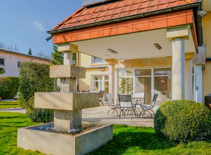 • Garten mit gepflegter Grünfläche und Springbrunnen