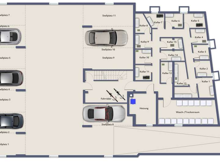 Das Gebäude ist voll unterkellert und bietet eine Tiefgarage mit 11 Pkw-Stellplätzen. Des weiteren sind hier die Kellerabteile für die Mieter sowie ein Wasch- und Trockenraum vorhanden. Im Außenbereich befinden sich weitere 5 Pkw-Stellplätze, die alle gut anfahrbar sind.
