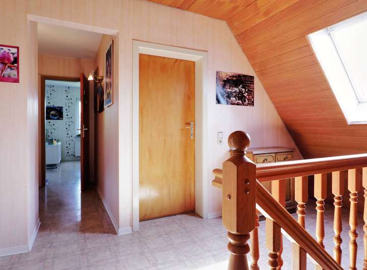 Eine massive Echtholztreppe führt ins Dachgeschoss mit drei Schlafzimmern und einem kleineren Zimmer, das sich gut als Büro oder Rückzugsort eignet. Auch das Badezimmer befindet sich hier.
