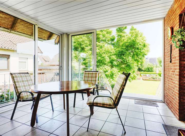 Das Haus selbst wurde 1963 erbaut und 1978 erweitert. Es bietet heute ca. 152 m² Wohnfläche zuzüglich eines großzügigen Wintergartens mit aufschiebbaren Glasflächen und direktem Blick über das Grün. Im Erdgeschoss liegt ein zentraler Flur mit offenem Kamin. Von dort aus geht es in das Wohnzimmer und in ein weiteres Zimmer, das aktuell als Esszimmer genutzt wird Die Küche ist hochwertig ausgestattet, mit Marmorarbeitsflächen. Ein Gäste-WC mit Dusche ergänzt die Etage.