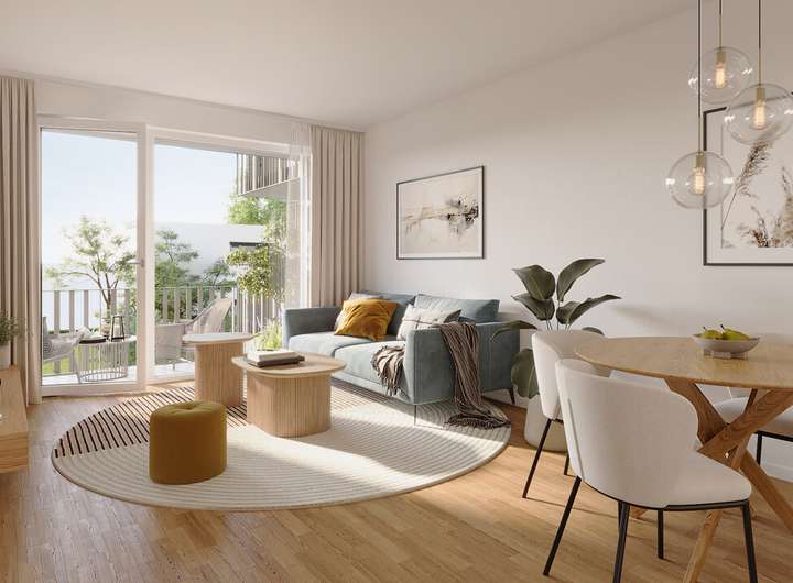 …sind alle privaten Freibereiche ausgerichtet – ob Terrasse mit Garten, Balkon oder Dachterrasse. Alpenblick in den oberen Etagen inklusive.