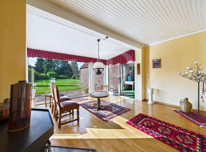 An das geräumige Wohnzimmer schließt sich ein heller Wintergarten. Hier überzeugt ein funktionaler Kamin, der gerade in den kühleren Monaten für eine angenehme Wärme sorgt und eine wohnliche Atmosphäre schafft. Genießen Sie den schönen Ausblick in den großzügigen Garten und verbringen entspannte Stunden unabhängig vom Wetter.
