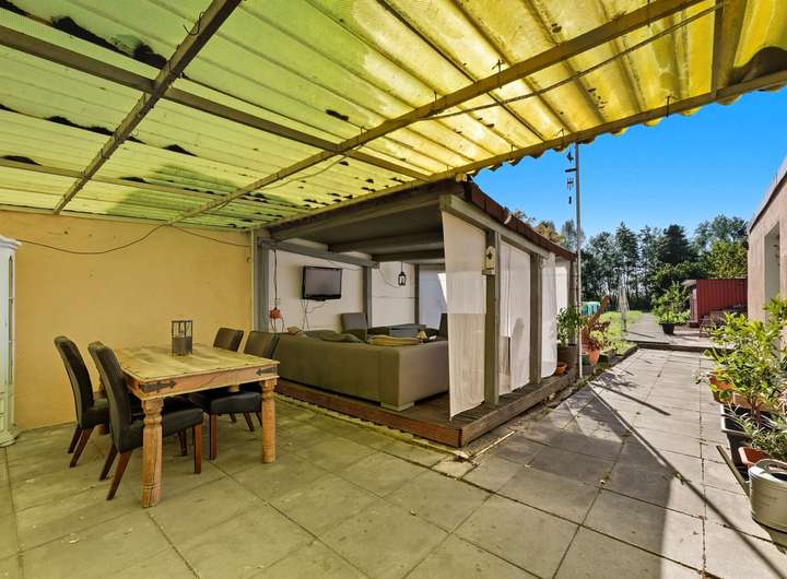 Zum Außenbereich gehören eine Garage, eine Terrasse sowie ein Gäste-WC, welches sich direkt neben der Terrasse befindet. Der große Garten lädt zum Verweilen ein.