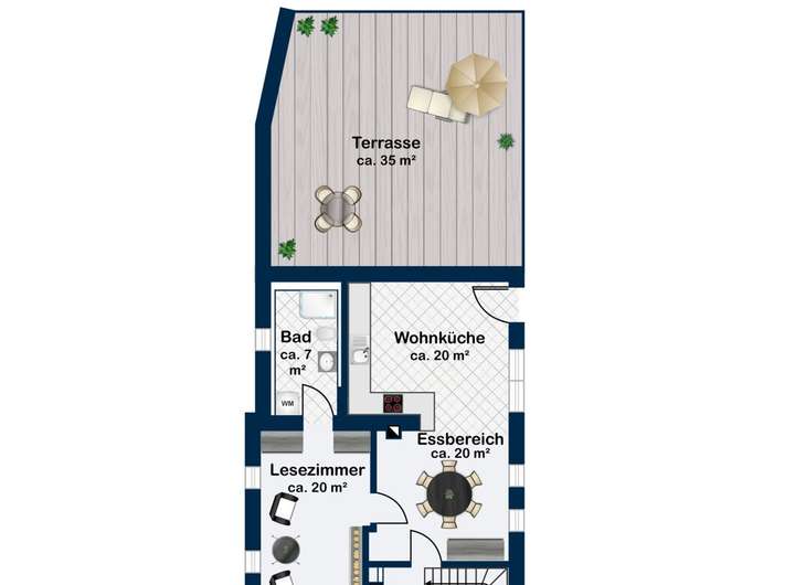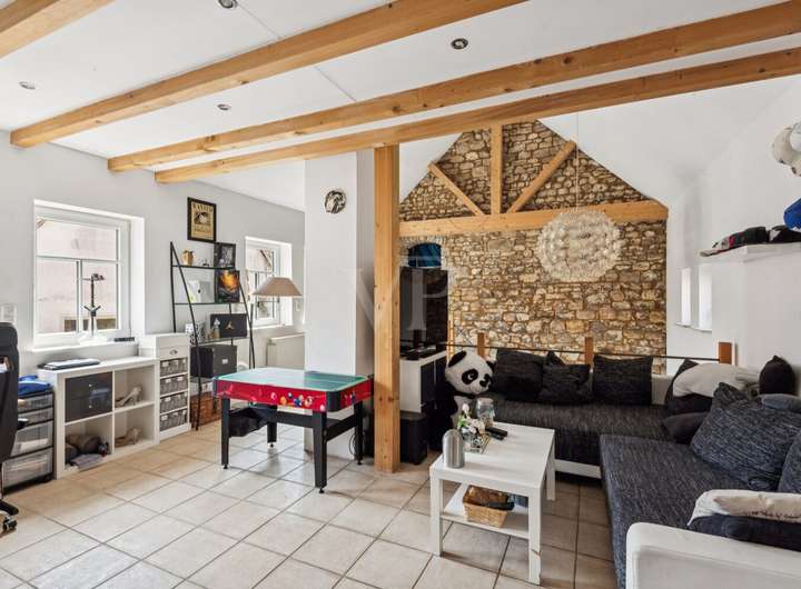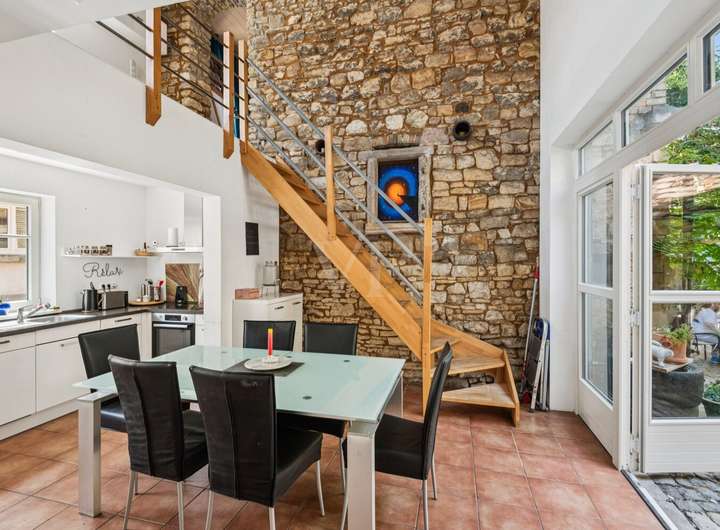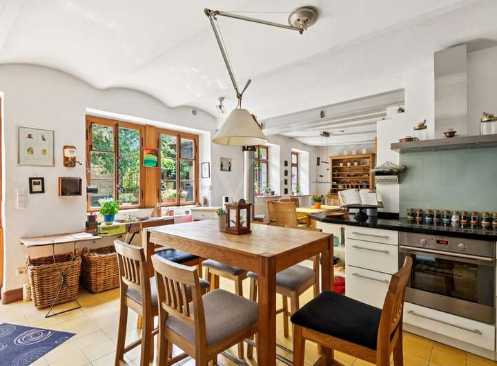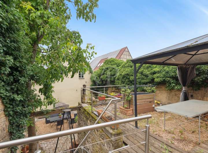 Das rund 690 m² große Grundstück bietet zahlreiche Besonderheiten, die man anderswo vergeblich sucht: historisches Kopfsteinpflaster, ein ca. 40 m² großes Kellergewölbe, das heute als stimmungsvoller Festkeller dient, sowie die darüberliegende ca. 35 m² große Dachterrasse. Der geschlossene, uneinsehbare Innenhof schafft Privatsphäre und beherbergt eine ca. 35 m² große Terrasse/Freisitzfläche – perfekt für entspannte Stunden im Freien.