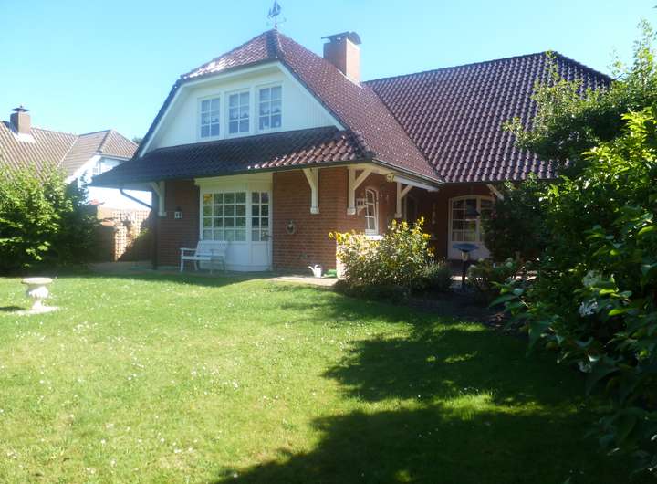 Bereits auf den ersten Blick überzeugt die Immobilie mit ihrer unverwechselbarer roten Klinkerfassade, den glasierten Dachpfannen mit formschönen Gauben und einer zum Baustil passenden Garage. Terrasse, Garten und der überdachte Eingangsbereich mit gepflastertem Vorplatz bieten Behaglichkeit und runden das Erscheinungsbild des Hauses ab. Im Inneren empfängt Sie ein heller, großzügiger Eingangsbereich mit Windfang und geschwungener Treppe. Die verglaste Doppelflügeltür verleihen dem Raum eine elegante, luftige Atmosphäre. Das gesamte Raumkonzept ist zum Teil offen gestaltet. Im Erdgeschoss bildet der ca. 56 m² große Wohn- und Essbereich das Herzstück des Hauses – mit zum Teil bodentiefen Fenstern und direktem Zugang zur überdachten Terrasse. Ein Kachelofenkamin sorgt für Gemütlichkeit. Die Küche ist durch einen praktischen Vorrats- und Verbindungsgang mit Einbauschränken direkt an die Garage angebunden – ein durchdachtes Detail für den Alltag. Ergänzt wird das Raumangebot auf dieser Ebene durch ein Schlafzimmer, ein Büro ein Gäste-WC, sowie ein helles Duschbad. Ein weiteres Highlight stellt die großzügige Wohnung im Dachgeschoss mit einer Wohnfläche von ca. 100m² dar. Der Teilkeller verfügt über einen Hauswirtschaftsraum, einen Abstellraum und den Heizungsraum mit Tanklager. Die Heizungsanlage von Brötje, wurde 2024 erneuert.