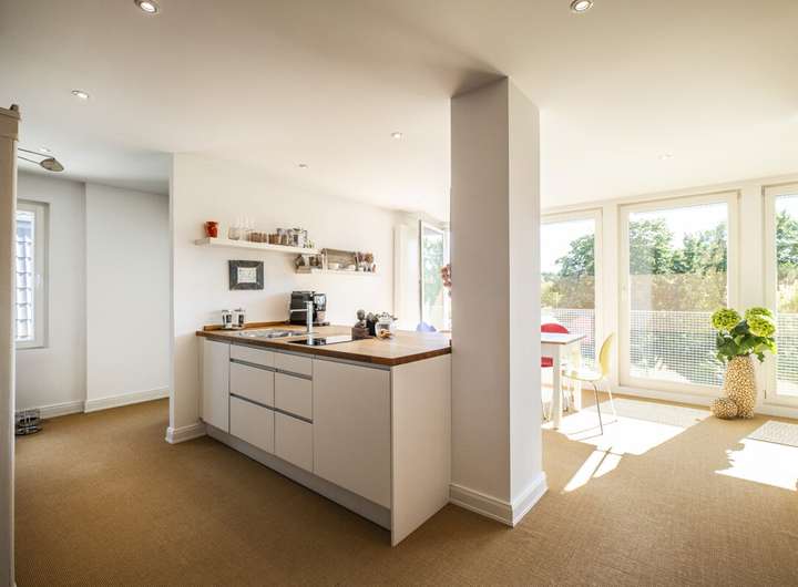 Mittelpunkt des Hauses ist unverkennbar eine einzigartige, ca. 50 qm große, Wohnküche. Mit hellen Einbauten, dem Gasherd direkt in der Mitte, mit dem Blick in den Garten, der direkt angrenzenden Südterrasse und den bodentiefen Fenstern sind nur ein paar Highlights genannt.