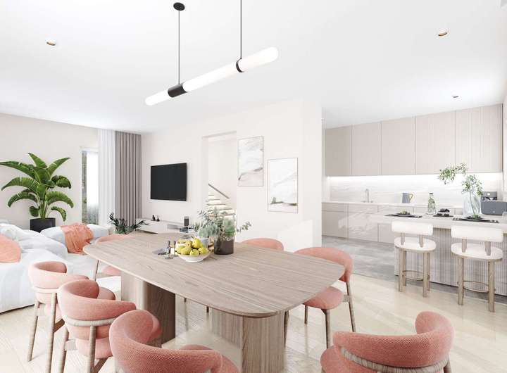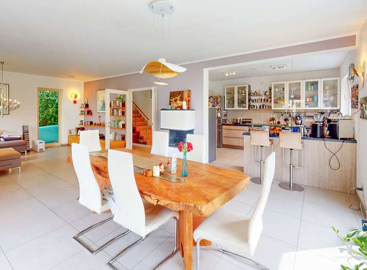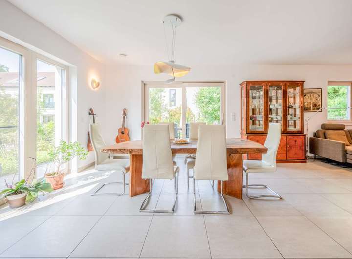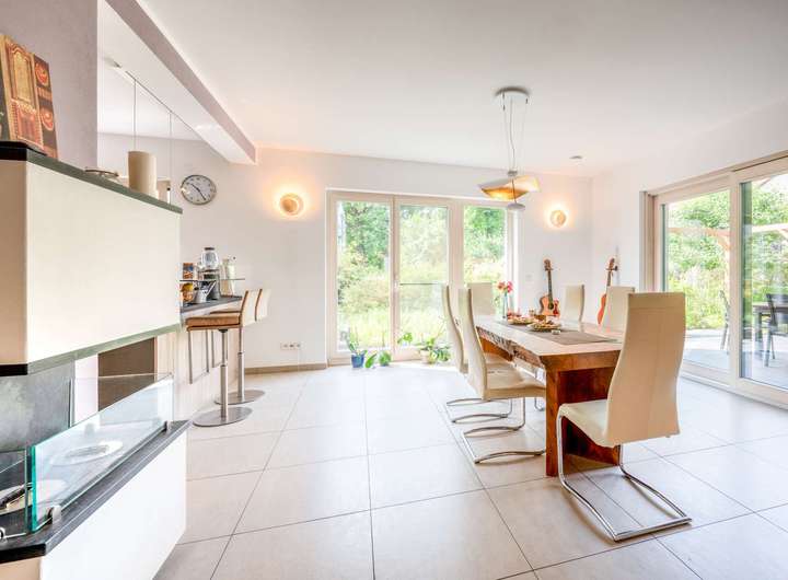 Im Erdgeschoss befindet sich der großzügige und offen gestaltete Wohn- und Essbereich mit direktem Zugang zur Gartenterrasse. Bodentiefe Fensterflächen sorgen hier für eine helle, einladende Atmosphäre und schaffen fließende Übergänge zum liebevoll angelegten Außenbereich. Die Böden im gesamten Wohn- und Essbereich sind mit großformatigen Fliesen ausgestattet, die eine stilvolle und pflegeleichte Wohnbasis bilden. Ein moderner Cultfire-Kamin sorgt an kühlen Tagen für eine behagliche Wohlfühlatmosphäre. Ergänzt wird das Raumangebot durch ein Gäste-WC, einen praktischen Abstellraum sowie den Technik- und Hauswirtschaftsraum, die funktional angeordnet und optimal in das Raumkonzept integriert sind.