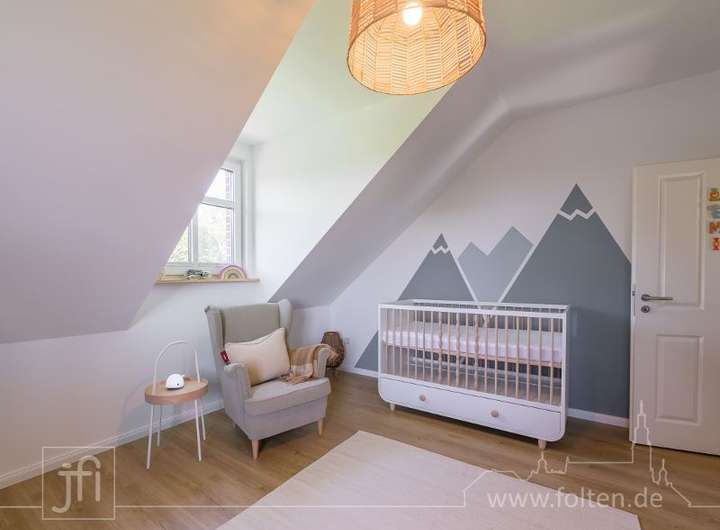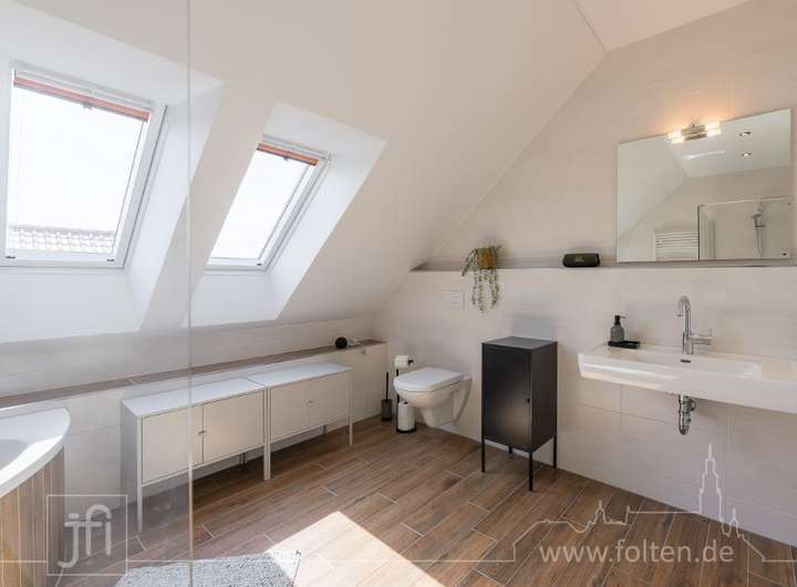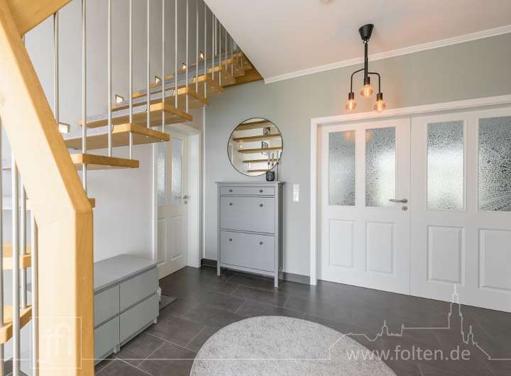 Die offenen, lichtdurchfluteten Wohnräume lassen kaum Wünsche offen. So stehen Ihnen im Erdgeschoss das Wohn- und Esszimmer mit angrenzender, offener Küche, das Gäste-Duschbad und der Wirtschaftsraum zur Verfügung. Sehr praktisch: Die Garage ist direkt mit dem Haus verbunden, sodass Sie Einkäufe usw. ohne Umwege in die Wohnräume bringen können. Von der Eingangsdiele aus erreichen Sie über die elegante Holztreppe mit freitragenden Stufen und Edelstahl-Geländer das Obergeschoss. Hier finden Sie das Schlafzimmer, zwei weitere Zimmer, einen Ankleideraum sowie das großzügige Bad mit Badewanne und Dusche.