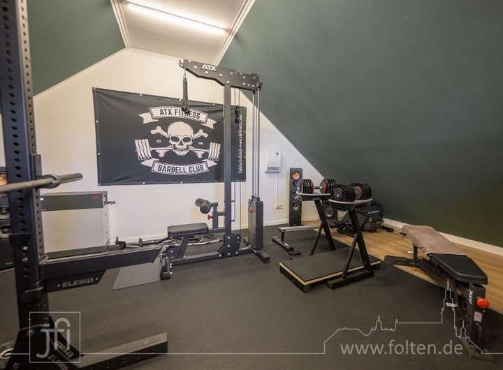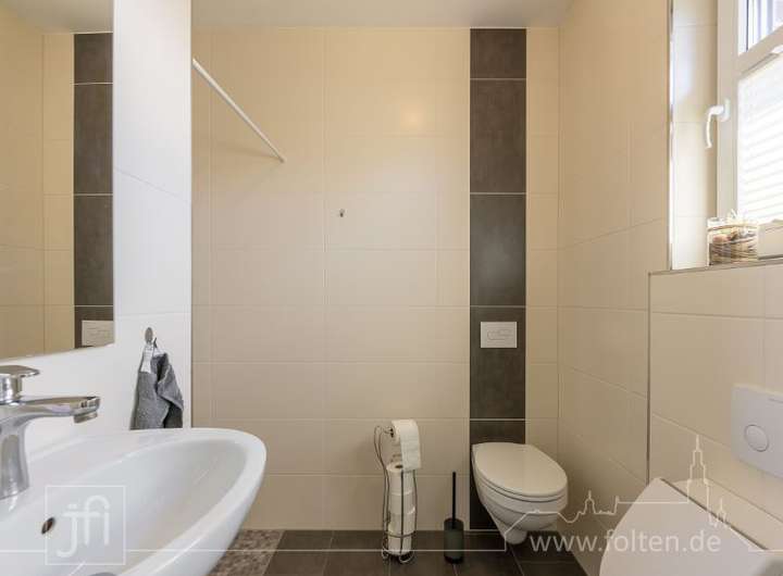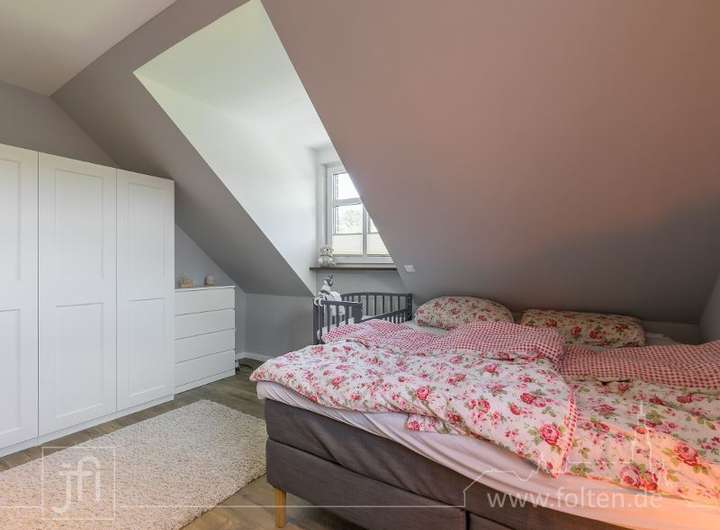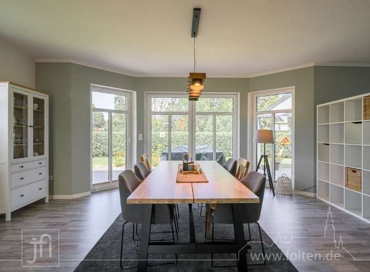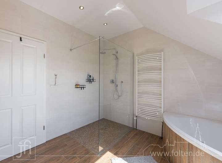 Die Ausstattung dieses tollen Hauses lässt kaum Wünsche offen: Die zweifarbigen Kunststoff-Sprossenfenster sind selbstverständlich 3fach-verglast und lassen sich bei Bedarf mit den elektrischen Aussenrollläden abdunkeln. Die Zimmertüren sind stilvoll als Kassettentüren in weiss gestaltet, im Erdgeschoss überwiegend sogar mit Glas-Ausschnitt. Bodentiefe Fenster im Wohn- und Essbereich geben den Blick in den Garten und auf die große Terrasse frei, die in Teilen mit einer hochwertigen Terrassenüberdachung überdacht ist. Das Haus wurde in sehr energieeffizienter Holzrahmenbauweise errichtet und außen mit aufwändigem Klinkermauerwerk gestaltet. Auf der südlichen Dachfläche wurde 2022 eine PV-Anlage (9,875 kWp mit 5,1 kW Speicher) montiert. Die Garage überzeugt mit einem elektrischen Sektionaltor, dem Werkstattbereich sowie dem als Hobbyraum genutzten Spitzboden.
