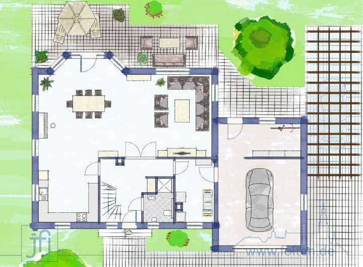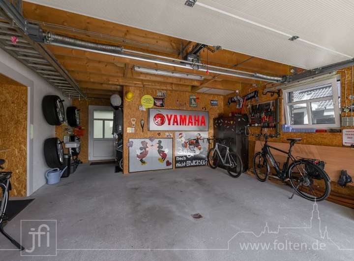 Der liebevoll angelegte Garten mit großer, teilüberdachter Terrasse lädt zum Entspannen ein. Neben der Garage, in der sich auch noch eine Werkstatt unterbringen lässt, rundet ein Carport das Platzangebot ab.