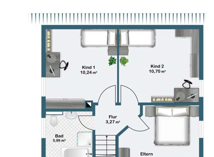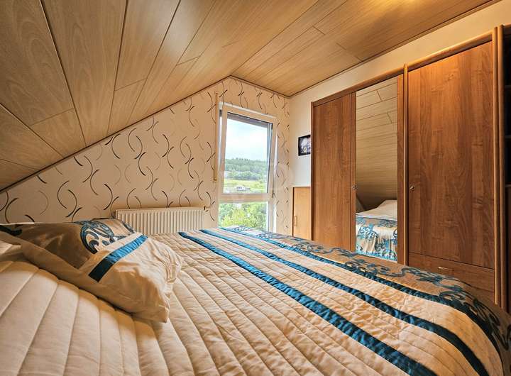 Das Haus umfasst insgesamt vier Zimmer, darunter drei gut geschnittene Schlafzimmer und ein helles, geräumiges Wohnzimmer. Die Aufteilung ist funktional gestaltet: Im Erdgeschoss lädt der großzügige Wohn- und Essbereich zum Verweilen ein. Durch die großen Fensterflächen gelangt viel Tageslicht ins Haus. Im Obergeschoss befinden sich die Schlafzimmer und das Familienbadezimmer, das mit Dusche und Wanne und zeitlosen Fliesen ausgestattet ist.