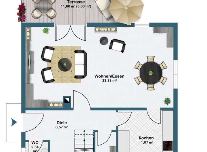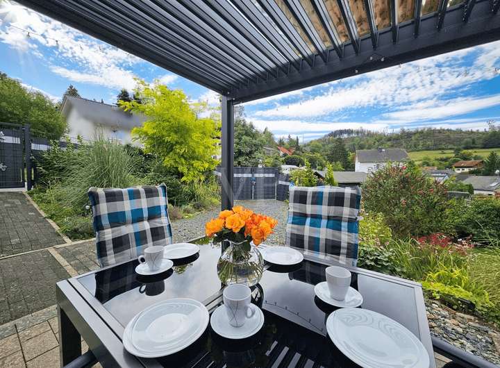 - überdachte Terrasse (mit Lamellendach) sowie zusätzlichem Seitenrollo