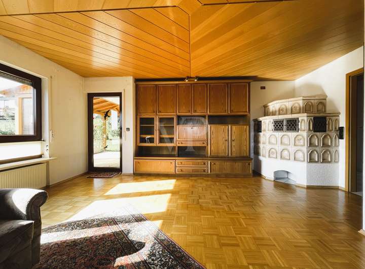 Im Erdgeschoss befindet sich der großzügige Wohn- und Essbereich, in dem sich der Kachelofen als gemütlicher Mittelpunkt auszeichnet. Hier ist die Einbauküche mit allen notwendigen elektrischen Großgeräten integriert und bietet ideale Voraussetzungen für kulinarische Aktivitäten. Von hier aus gelangen Sie auf die weitläufige Terrasse mit überdachtem Freisitz, die zu geselligen Stunden im Freien einlädt.