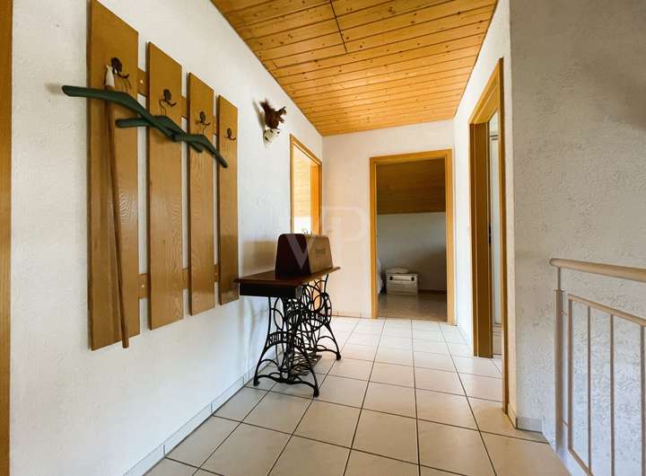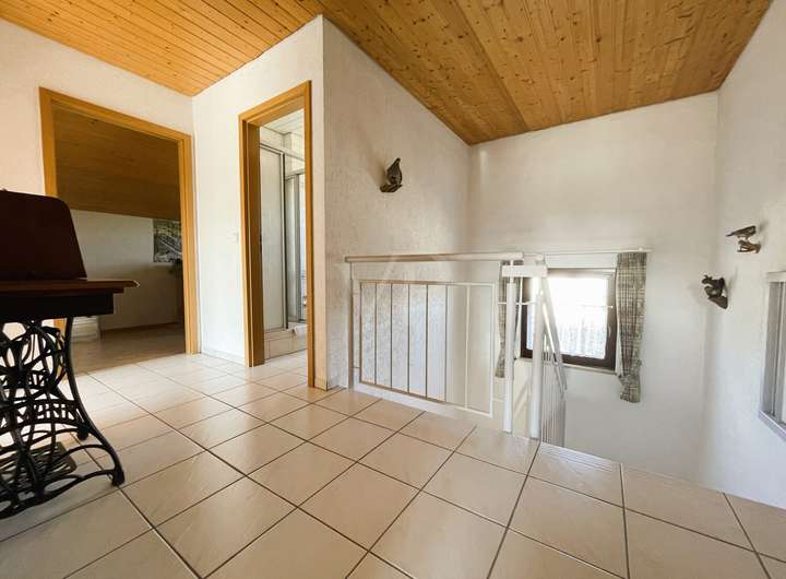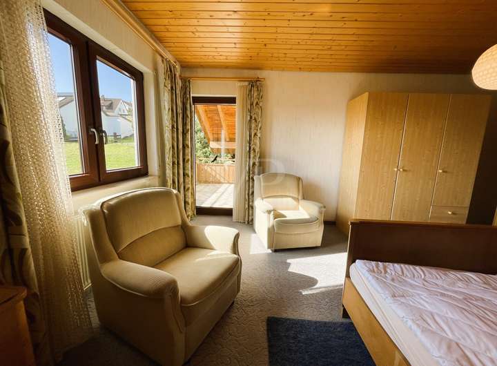 Drei Schlafzimmer bieten ausreichend Privatsphäre und Rückzugsmöglichkeiten für alle Bewohner. Darüber hinaus verfügt das Haus über zwei Bäder: ein modernes Dusch-WC im Dachgeschoss sowie ein weiteres Bad im Erdgeschoss. Ein separates Gäste-WC gewährleistet zusätzlichen Komfort für Besucher. Die Holzdecken in Erd- und Dachgeschoss vermitteln eine wohnliche Atmosphäre.