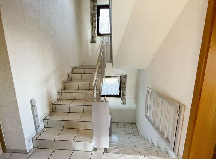 Über einen Eingang im Untergeschoss gelangen Sie in den funktionalen Vorraum, von dem aus Sie die geflieste Garage betreten können. Die Garage ist mit einem elektrischen Torantrieb sowie einem Ausgussbecken ausgestattet – praktisch in der täglichen Nutzung. Zusätzlich bietet das Haus einen Fahrrad- und Müllschuppen, der für Ordnung und Stauraum sorgt, sowie ein Holzlager direkt am Gebäude.