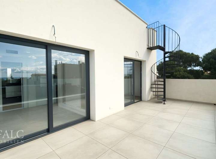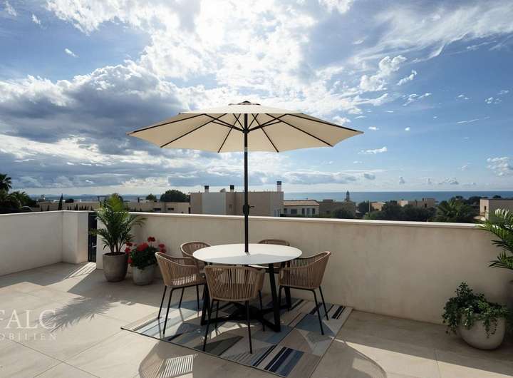 Von beiden Schlafzimmern im Obergeschoss hat man Zugang zu einer großzügigen Terrasse mit Meerweitblick. Von dort führt eine weitere Treppe hinauf zur Dachterrasse, die ebenfalls einen beeindruckenden Blick auf das Meer bietet - ideal, um Sonnenuntergänge zu genießen oder entspannte Stunden im Freien zu verbringen.