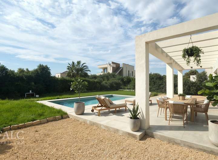 Zum Verkauf steht eine exklusive Villa in Cala Pi, gelegen in einer ruhigen Wohngegend am Torrent de Cala Pi. Diese hochwertige Immobilie bietet modernen Wohnkomfort auf circa 125 m² Wohnfläche und befindet sich auf einem großzügigen Grundstück von circa 606 m² mit einem schön angelegten Garten und privatem Pool.