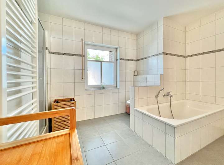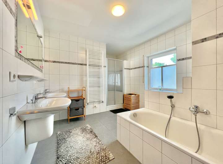 - Tageslichtbad mit Dusche, Badewanne, WC, 2 Waschbecken, Fußbodenerwärmung und Handtuchheizkörper