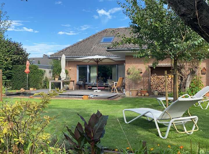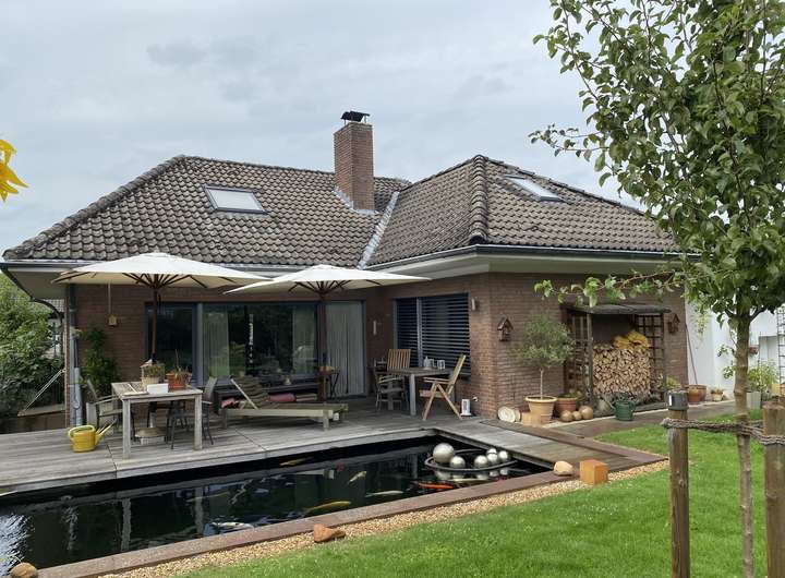 Freistehendes Haus in Massivbauweise, vollunterkellert im Jahr 2012 / 2013 nach KfW Richtlinien energetisch saniert. Der außergewöhnlich gestaltete Garten wurde nach Vorgaben eines Gartenarchitekten angelegt. In dem Garten wurde ein biologischer Teich, der sowohl als Koi- oder Schwimmteich genutzt werden kann angelegt. Bei der Sanierung wurde auf hochwertige Materialien geachtet. So wurden in den Bädern Grohe Armaturen und Duravit Keramik verbaut. Das Haus hat Fenster der Marke Schüco mit Dreifachverglasung. Beheizung und Warmwasser-Versorgung wird durch einen energiesparenden Weishaupt Öl-Brennwertkessel gewährleistet. Die verbauten Design-Heizkörper der Marke Zehnder vervollständigen die hochwertige Ausstattung. Ferner wurden in den gesamten Wohnbereichen die Wände mit einem hochwertigen Gips Putz versehen. Was den Vorteil hat, daß nicht tapeziert werden muss. Die großzügige Terrasse ist mit Wetterbeständigem Tropenholz, welches aus nachhaltigen Anbau stammt (FSC Siegel) belegt. Der Unterbau der Terrasse ist eine Betondecke, die mit dem Haus verbunden ist. Das Filetgrundstück ist nach Süden ausgerichtet und verwöhnt Sie von morgens bis abends mit Sonne. Selbstverständlich sind für den Sonnenschutz elektrische Raffstoremarkisen der Marke Roma, mit Fern-Steuerung der Marke Somfy vorhanden. Die Böden sind mit Marmor und Eichenparkett belegt. Die Küche ist eine Markenküche der Firma Alno und die Geräte der Küche sind überwiegend von Neff. Die Küche ist nicht im Kaufpreis enthalten- kann aber so wie auch der größte Teil der Einrichtung, vom Käufer mit erworben werden.