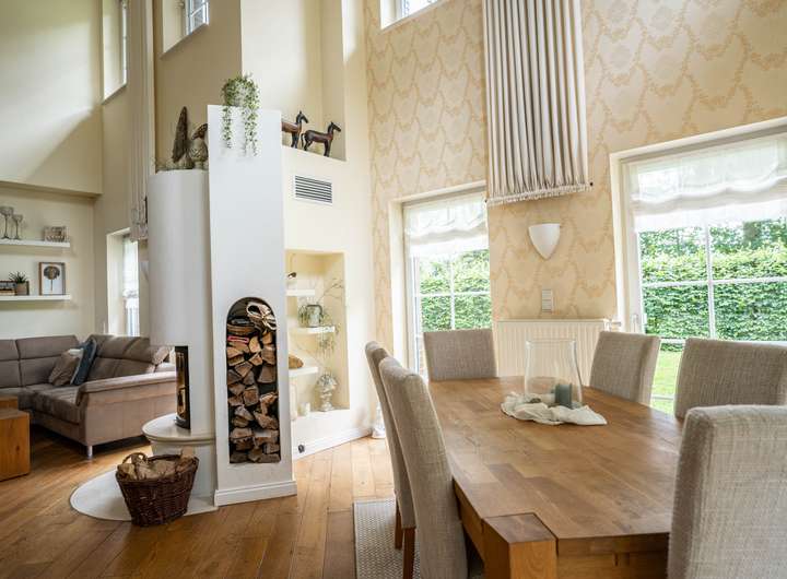 + Offener Wohn-, Ess- und Kochbereich mit Kaminofen