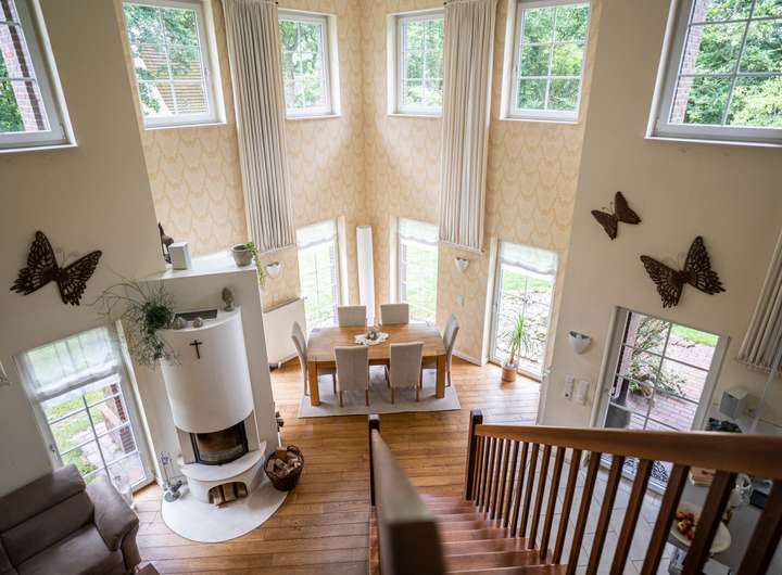 Im Erdgeschoss bildet der offen gestaltete Wohn-, Ess- und Kochbereich mit über 53 m² das Herzstück des Hauses. Bodentiefe Fenster sorgen für viel Tageslicht und einen schönen Ausblick in den Garten. Von dort aus gelangen Sie direkt zur angrenzenden Terrasse.