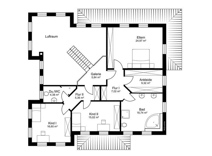 Vom Wohnbereich aus führt eine offene Treppe in das Obergeschoss. Über die Galerie erreichen Sie die beiden Kinderzimmer mit eigenem Badezimmer und den Elternbereich mit großem Schlafzimmer, begehbarer Ankleide und einem komfortablen Tageslichtbad mit Dusche und Badewanne.