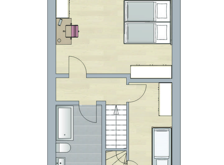 Das Obergeschoss verfügt über zwei weitere Zimmer und ein Badezimmer.