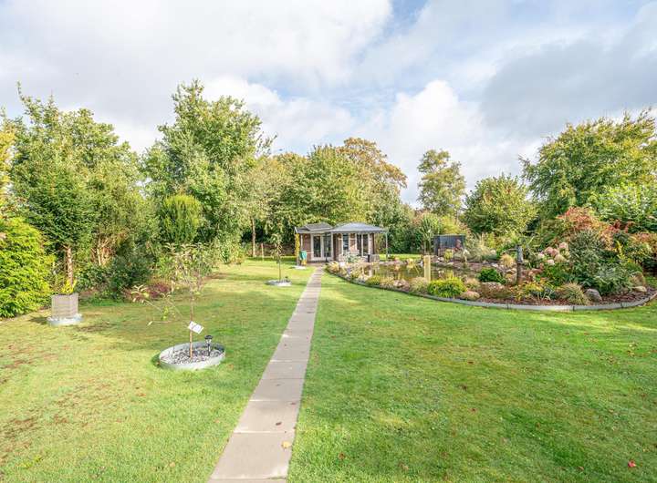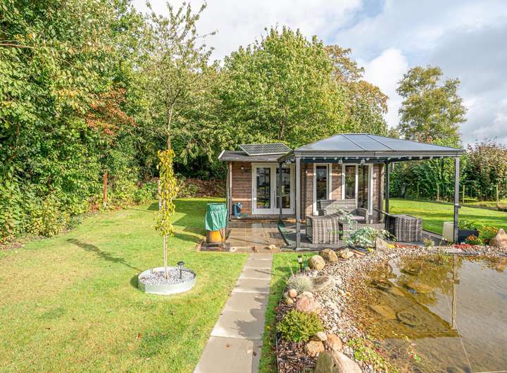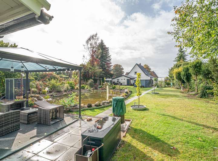 Der weitläufige Garten ist ein echtes Highlight. Mit seiner liebevoll angelegten Teichanlage (aus dem Jahr 2022), in der Koi-Fische leben, lädt er zum Verweilen und Entspannen ein – ein kleines Paradies für Groß und Klein.