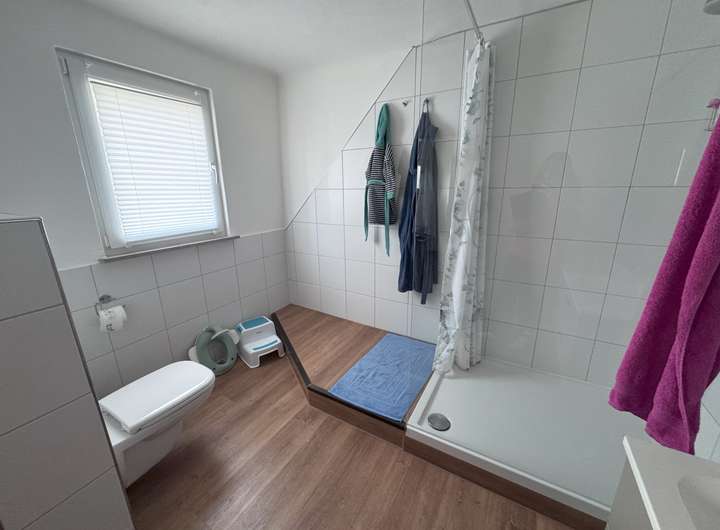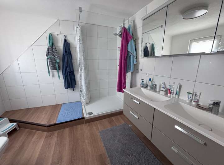 Das Tageslichtbadezimmer im 1. Obergeschoss besteht aus einem Doppelwaschtisch mit Unterschrank, einer großen Dusche mit tiefem Einstieg und einem WC. Weiterhin befinden sich im Obergeschoss 2 Schlafzimmer und eine Ankleide.