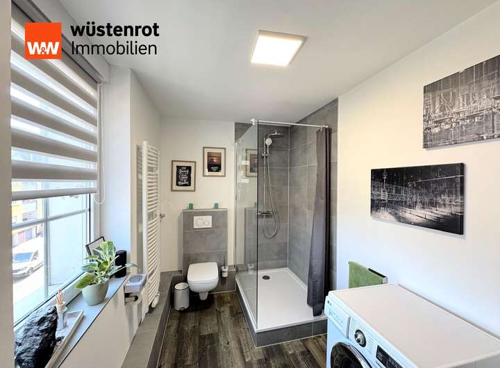Das sanierte Badezimmer befindet sich praktischerweise in der Mitte der Wohnung. Dahinter öffnet sich eine modern umgestaltete, offene Küche, die direkt in das lichtdurchflutete, großzügige Wohnzimmer übergeht – perfekt für geselliges Beisammensein.