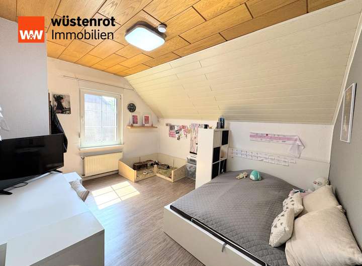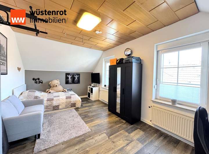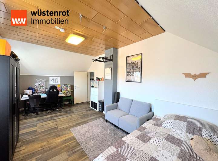 Vom Wohnzimmer aus erreichen Sie einen begehbaren Kleiderschrank, der an ein weiteres Zimmer grenzt. Dieses wurde bislang als Elternschlafzimmer genutzt, eignet sich jedoch ebenso ideal als Home-Office oder Gästezimmer.