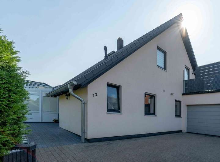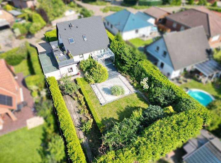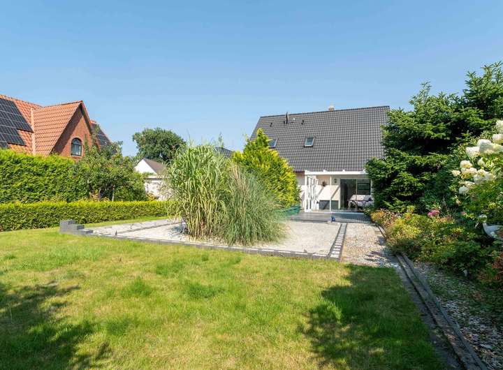 Dieses Zweifamilienhaus aus dem Jahr 1999 steht auf einem großzügigen Grundstück von rund 850 m². Der Garten ist bewusst pflegeleicht angelegt und dennoch hochwertig gestaltet.